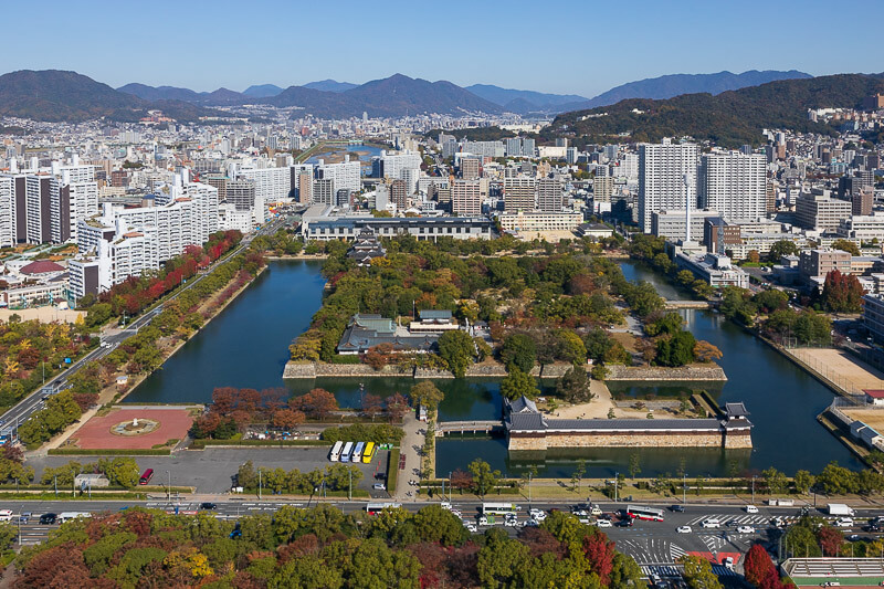 近世城郭は付近の高層ビルから見おろすとその規模がよく分かる。「リーガロイヤルホテル広島」からの眺望は群を抜いている。宿泊する機会があれば、どうぞ。