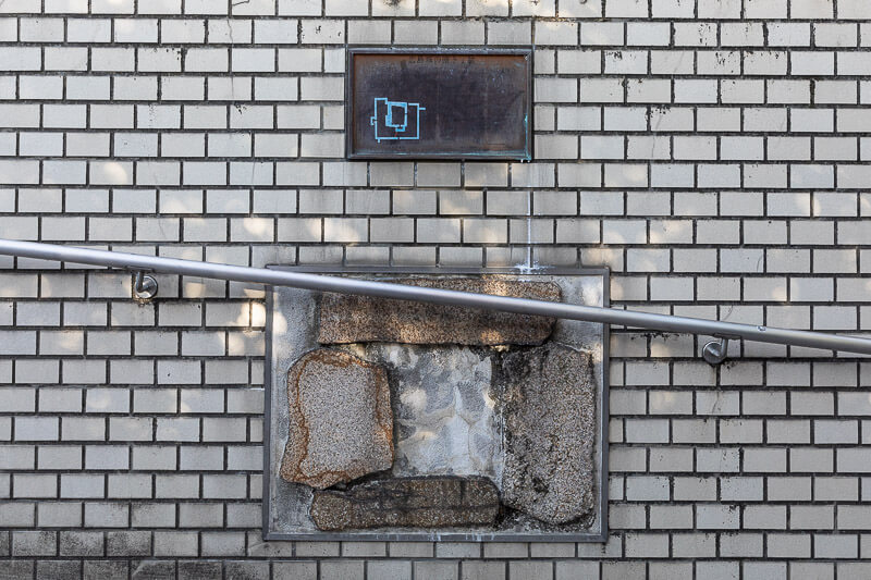 写真は、中堀石垣の石材で築かれた石垣モニュメント。広島県立総合体育館の北側にある。1991(平成3)年の建築工事の際、発掘された中堀跡の石垣が使われている(詳しい場所は上記Googleマップ参照)。このほか、広島城周辺の数か所に、石垣の石材を使ったモニュメントが残されている。