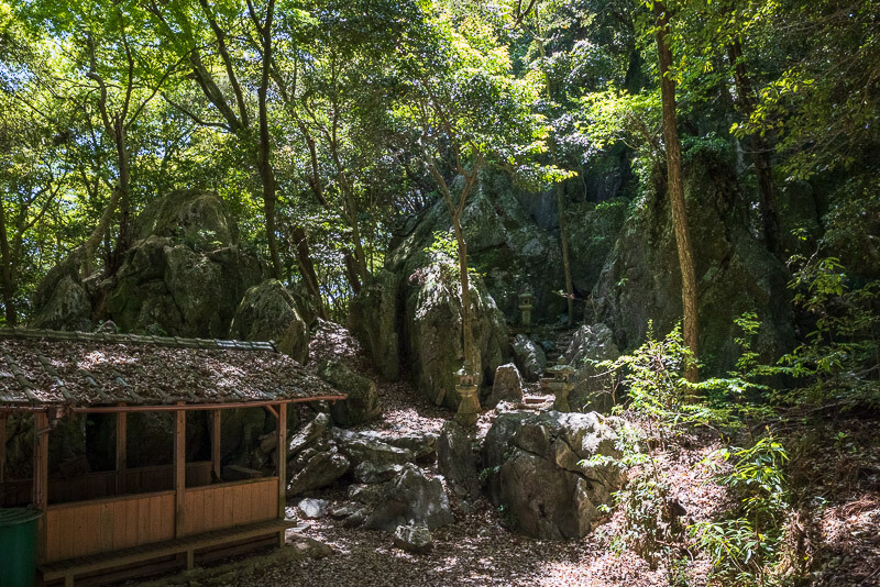 横山の山頂には北に岩国城(横山城)があり、南に護館神がある(城山展望台や三角点はさらに南)。そこは岩国城築城の際の石切場があり、石灰岩を尾根づたいに運び、岩国城の石垣を築造した。天明3年(1783)に天狗堂を建立、勝軍延命地蔵が安置されていたことがある。岩国藩祖吉川広家が12才の時、祖父にあたる毛利元就からもらったもので、吉川家の武運長久の守護神。ロープウェイ乗り場から南へ尾根づたいに徒歩20分、現地を訪れると累々と巨大な岩があり、一部に矢穴が見られる。