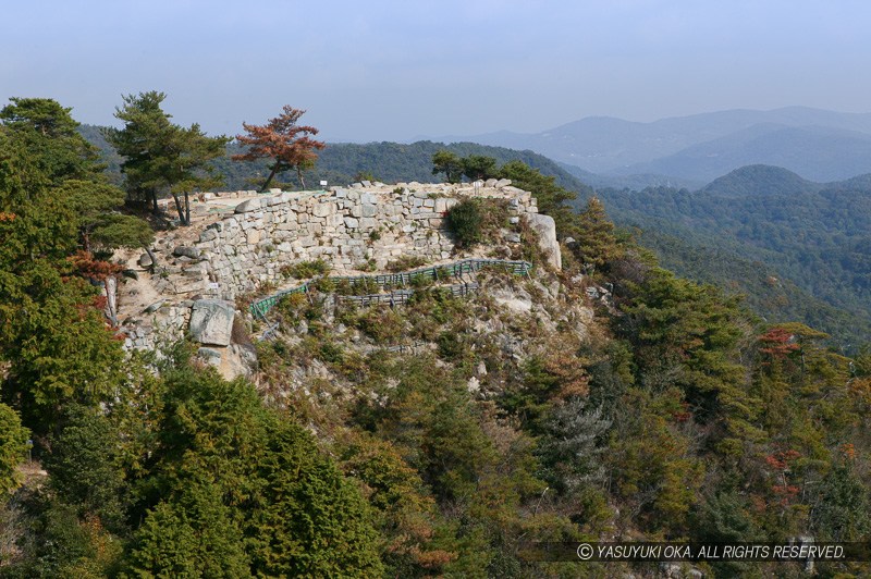 東側に位置する屏風折れの石垣は、尾根に向かって突出した高石垣が特徴。