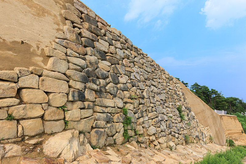 城壁は下部の幅約7m、高さは5〜7mで要所には石垣が積まれている。