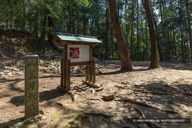 御蔵屋敷跡は本丸と釣井の壇の間に位置する帯状の郭である。三段に造成された広い区画で、物資や兵糧の収蔵を担ったと考えられる。現在も廃城時に崩された石垣が残されており、城の終焉を伝える貴重な遺構である。