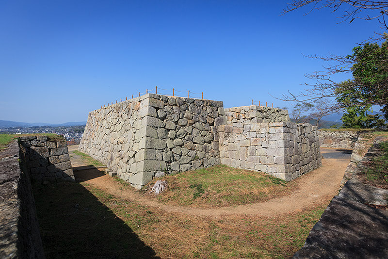 おそらく完存と思われる高石垣と厳重な防備が目を惹く。特に天守郭の搦手は圧巻。